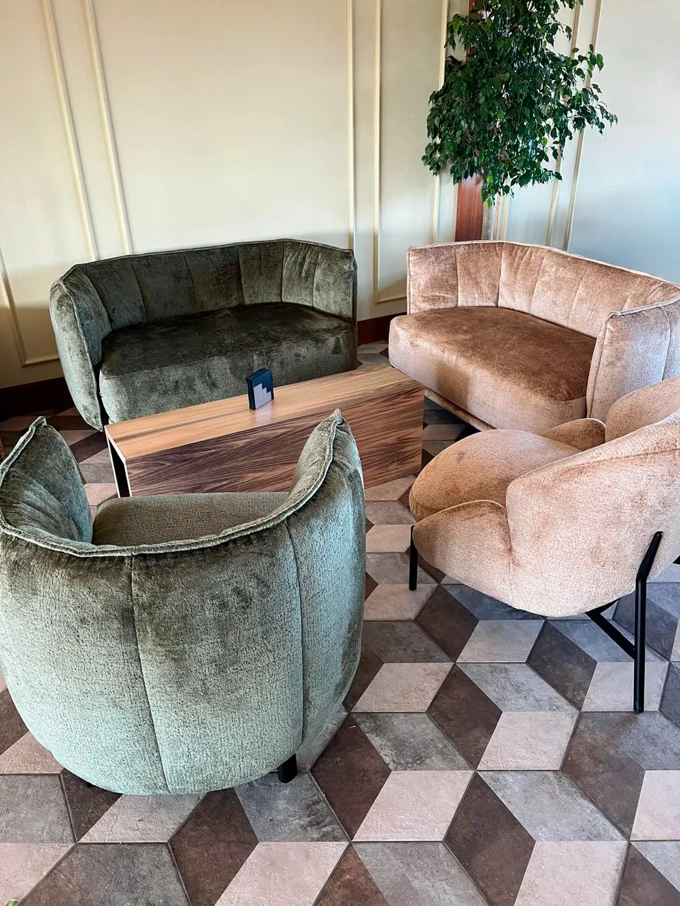 The Chain collection by Meneghello Paolelli Associati consists of two upholstered pieces, a sofa and an armchair, both used in the lounge areas together with Rica to create welcoming islands for conversation, listening and sharing.