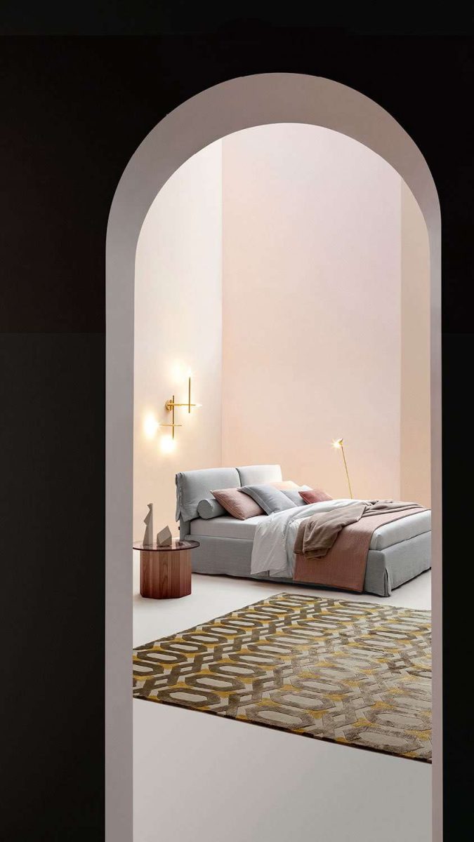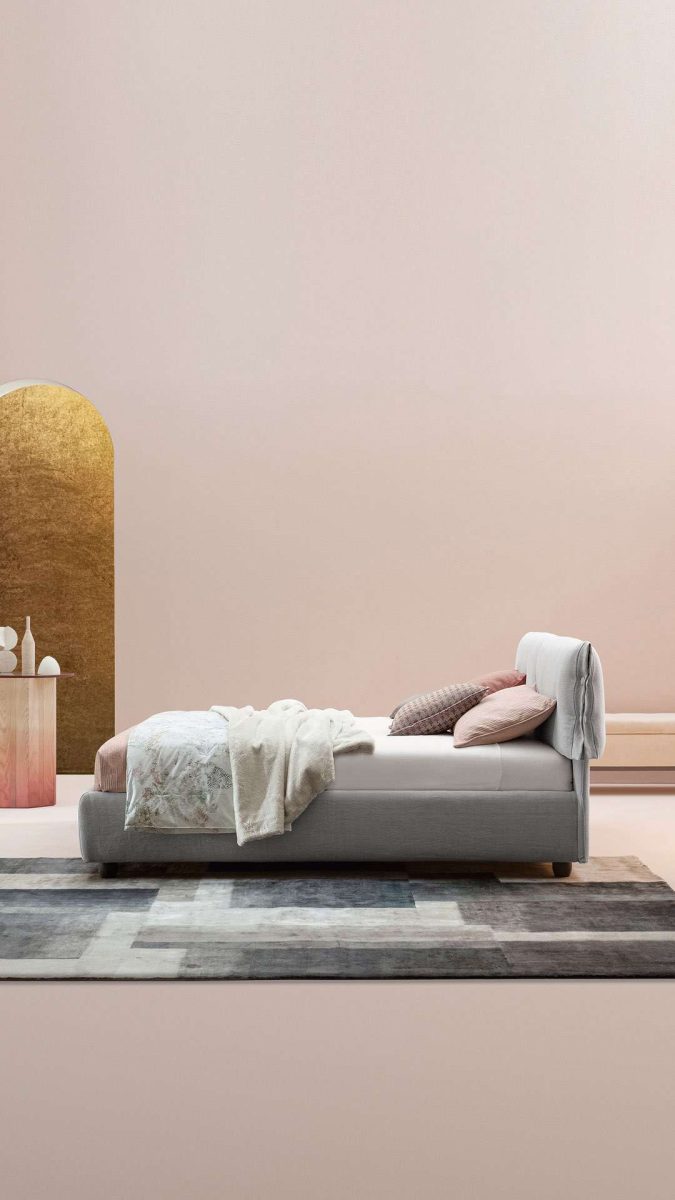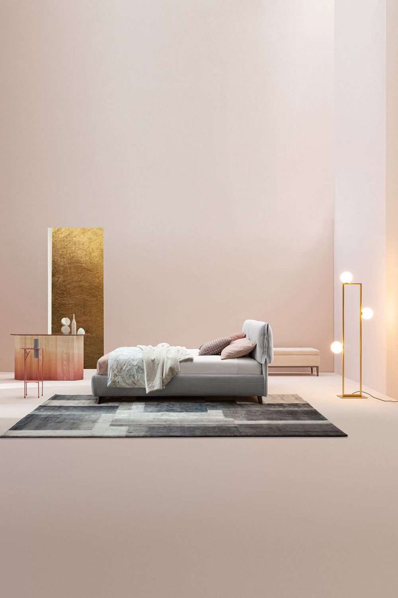 El cabecero está cubierto con dos cojines plegados y fijados con un ojal, cerrado en los laterales por dos macrobotones decorativos. Una solución formal inteligente que combina estética y racionalidad.